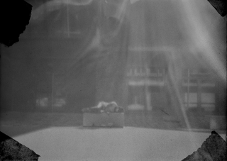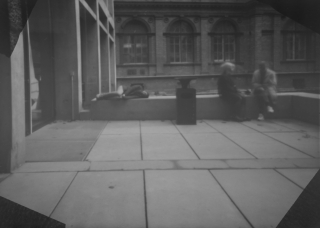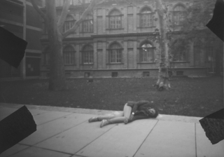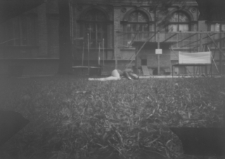 To accomplish this, the artist created a pinhole camera by housing a camera within a box and placing it at various locations in Vienna. She would lie down beside people for a few minutes before capturing frank images. This method allowed for natural reactions, as the subjects were unaware of the camera. During this time, the artist was overwhelmed with fatigue and isolation coming from the distressing news, which is exemplified in the photographs.